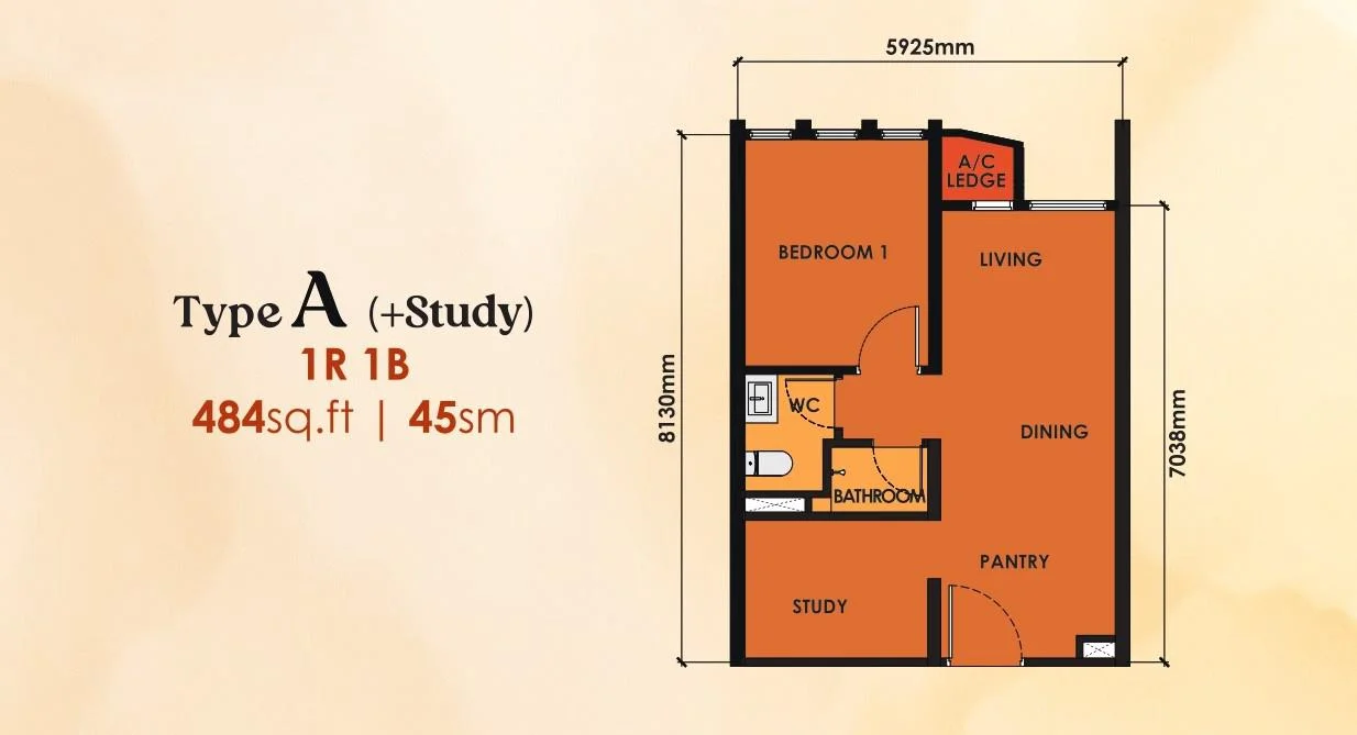 1-Bedroom Residence (484 sqft) – sleek, open-concept design for urban living.